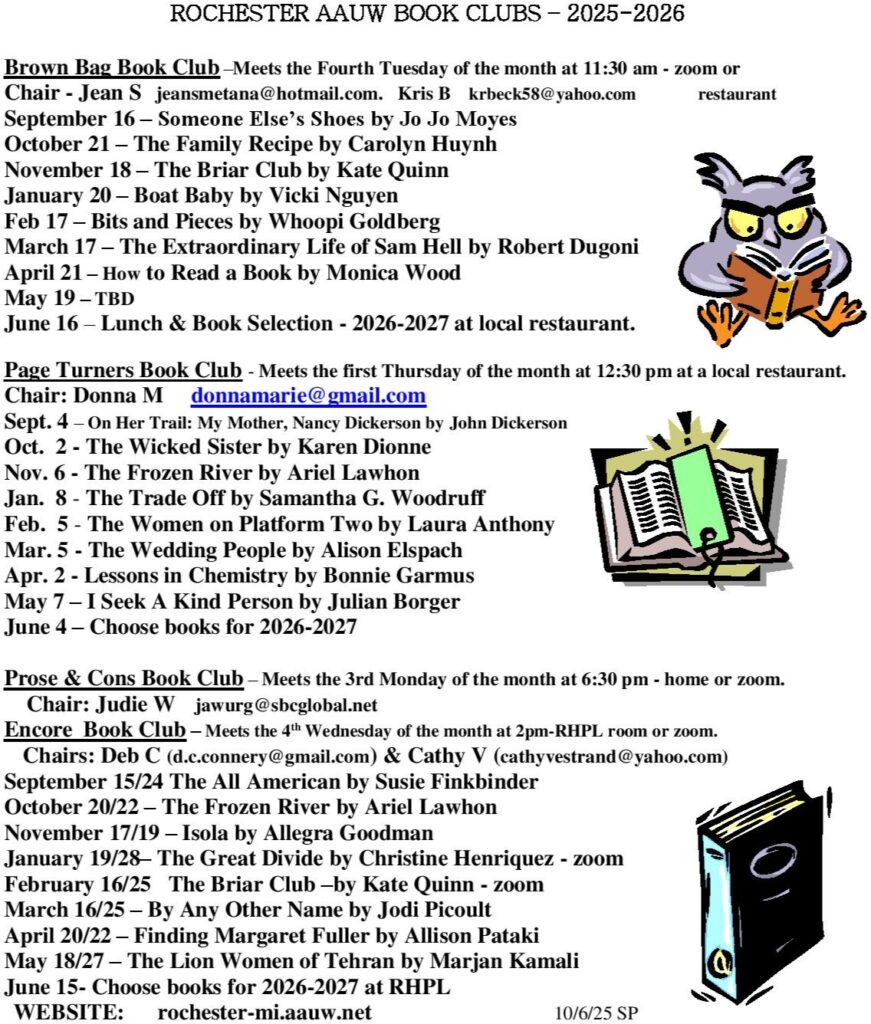 Rochester AAUW Book Clubs – 2025-2026 Page Turner’s Book Club discussing their monthly book pick at Mitchell’s Fish Market. View/download the book lists here!